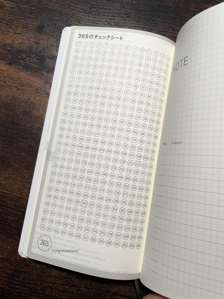 でも、「365“日”のチェック」ではなく、「365のチェック」というのがなんともミソな気がしていて、つまり「毎日はできなくても、後日挽回して365マスを埋める」という達成の仕方もできるわけです(笑)